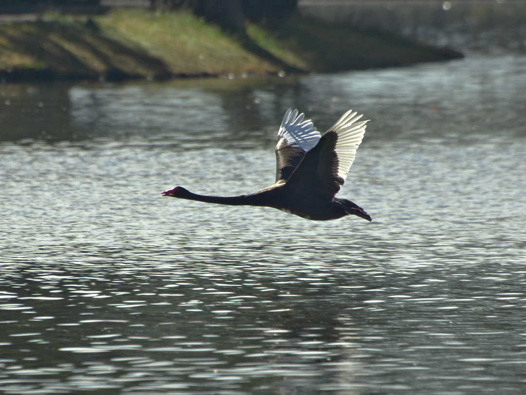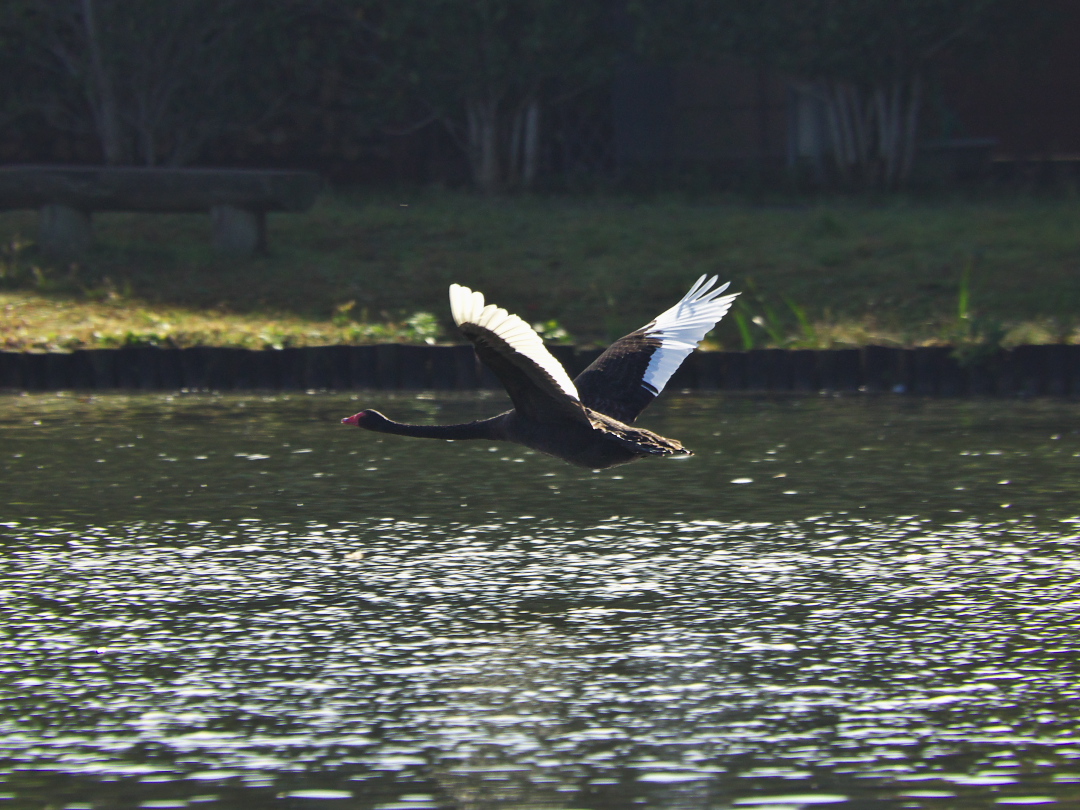 ハクチョウなのに逆光で真っ黒???―――いやいや、これはコクチョウでした。