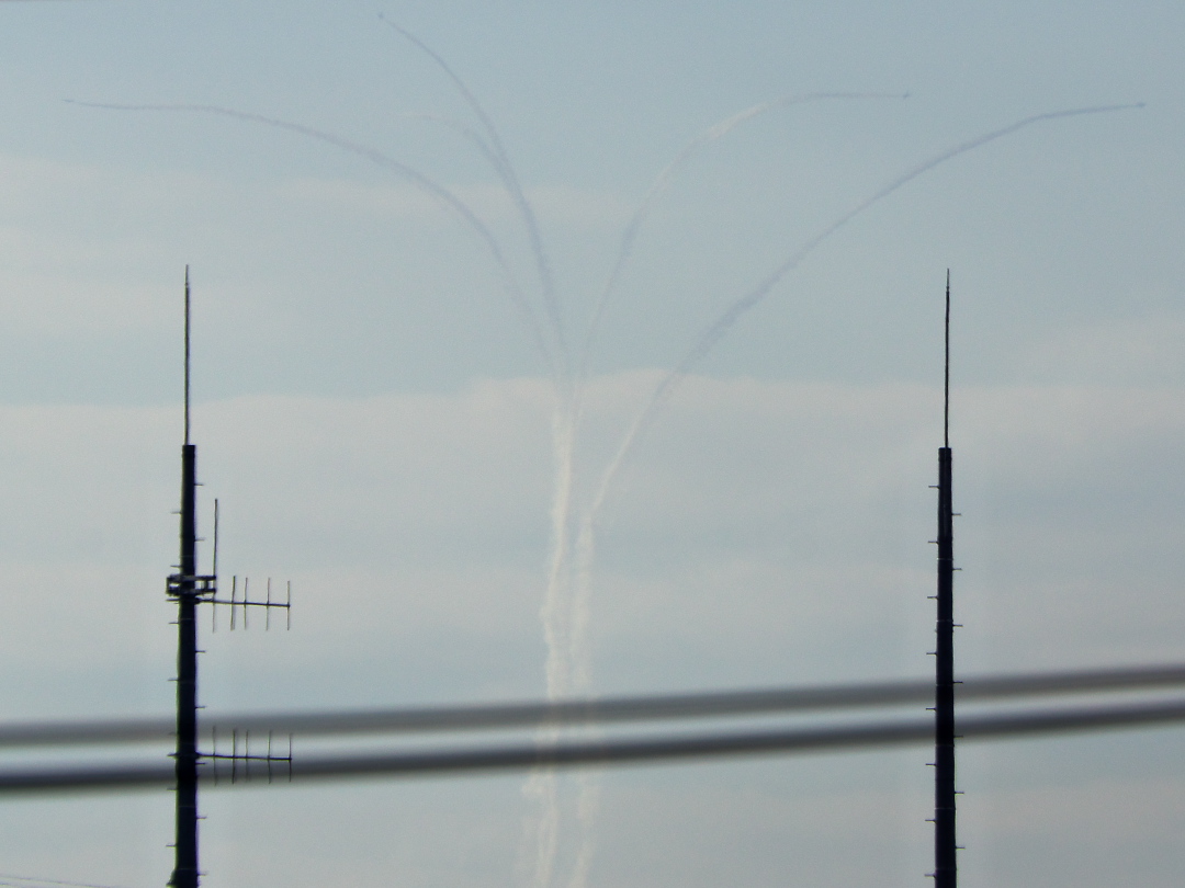 きょうは入間航空祭があるけど自粛(←こないだ百里航空祭行ったばかりだろ(^^ゞ)。でも、午後になって無線からブルーインパルスの「スモック‥‥‥なう!!」の声が聞こえはじめると、もう仕事する気にはなれず屋上へ。