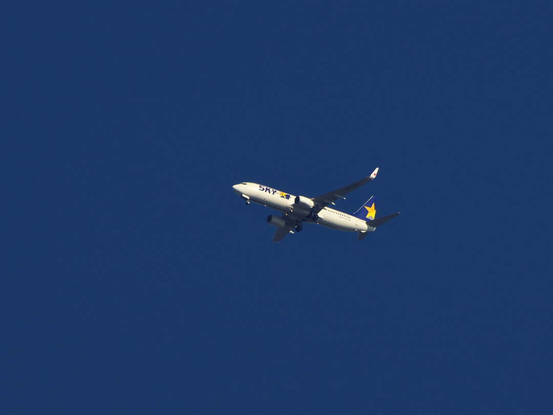 で、仕事に戻ろうと思ったら、反対側の東の空を低空で飛ぶスカイマーク機を発見!!