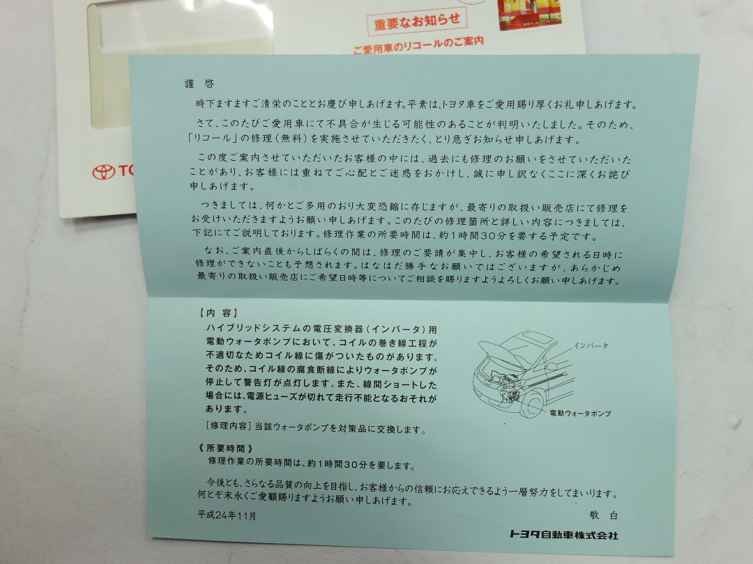 先月の中頃、TOYOTAから「重要なお知らせ」が届いた↓