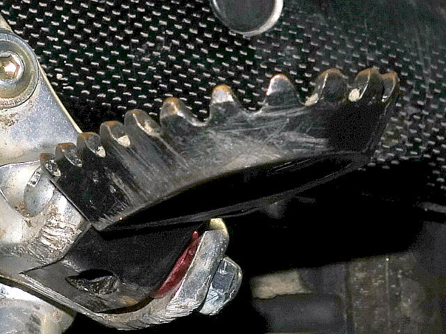 もちろんトライアル車のステップは折りたたみ式になっているので、何かにぶつかれば逃げる構造になっているのですが、当たる面に大きく角度か付けられていることによって、よりスムーズに逃げるようになり、さらには転倒等によって可動方向と逆の後ろからの大きな力が加わって、従来のステップでは変形してしまうような場面でも、斜め部分に当たって逃げる方向に力が分散され、変形しにくいステップであるといえるでしょう。
