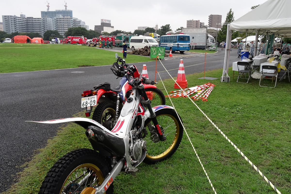今回は防災訓練そのものに参加したのではなく、東京都総務局総合防災部の方からの依頼により、防災訓練終了後に都の建設局、水道局、その他の方々に集まっていただき、被災地におけるバイクの有用性や優れた走破性を実際に見ていただくという「オフロードバイク実証検証」という名目のお仕事。