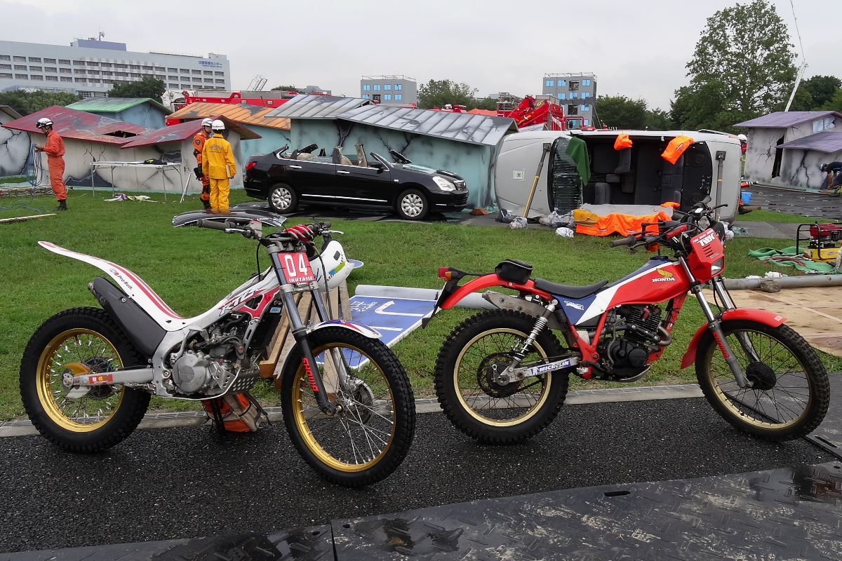左:最新鋭のトライアルマシンRTL260R、ライダーは現役バリバリの国際A級・生田目隊員。