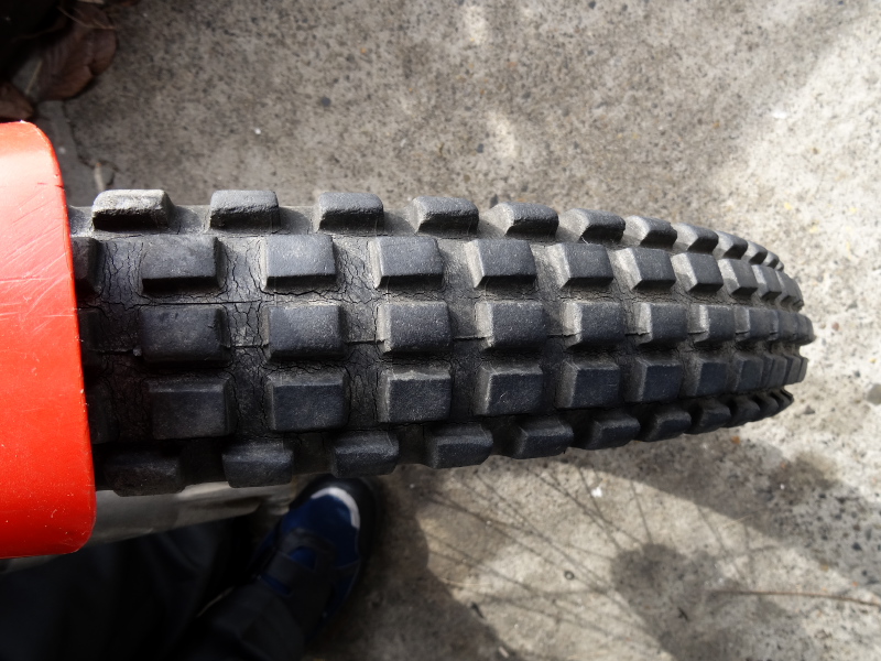 ↑これがその問題のフロントタイヤ。ゴムは完全に硬化してヒビだらけだし、なんと言っても舗装路ばかり走ってすり減ったブロック表面はツルッツルに磨かれたようになっているし、低圧で舗装路を走っていたためか、中央のブロックはあまり減らないのにその両脇の列のブロックが大きくすり減ってしまい、タイヤ断面が三角形のようになっていて、「タイヤが地面を掴む感覚」がまったくと言っていいほど感じられない乗り心地なのだ。