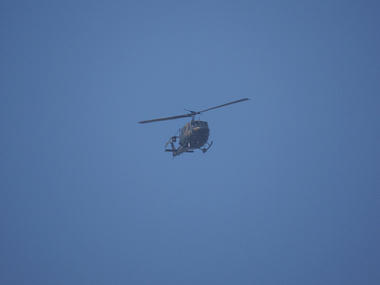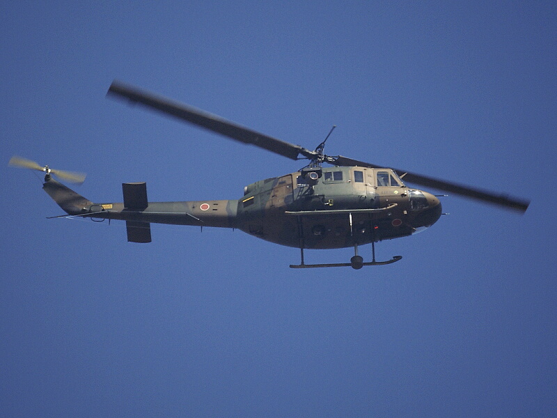 見上げるとやはり、陸上自衛隊のUH-1がこちらへ向かってゆっくりと飛んでくるのが見えた。きょうは晴れだし、位置的にも順光になるので色もバッチリ出てくれるはず