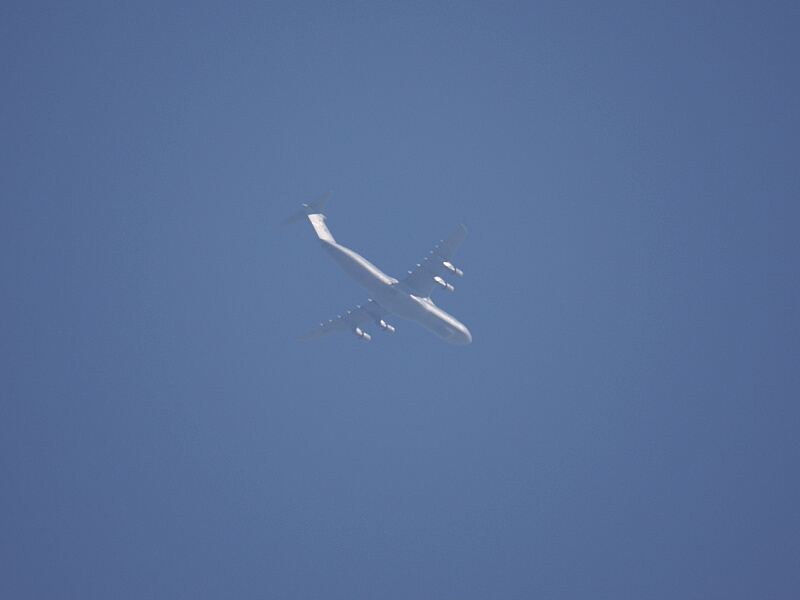 遠すぎてよくわからないのだけど、おそらくUS AIR FORCE(アメリカ空軍)のC-5“ギャラクシー”輸送機に違いない。