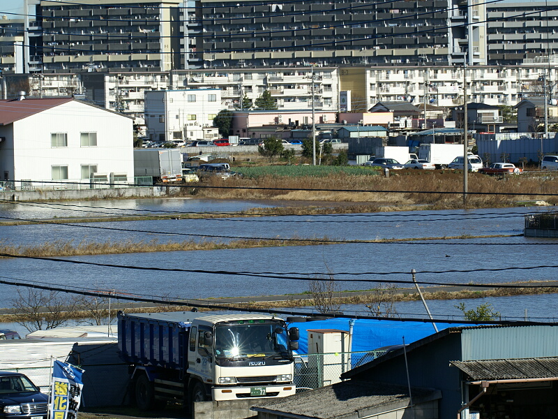 でも、きょうの朝はきれいに晴れて、ひさしぶりに澄み切った青空が広がっていたのですが、TWK屋上から見える「いつもの散歩コース」横の田んぼがまるで池のようになっていて、カルガモが一羽のんきに水面に浮かんでいました