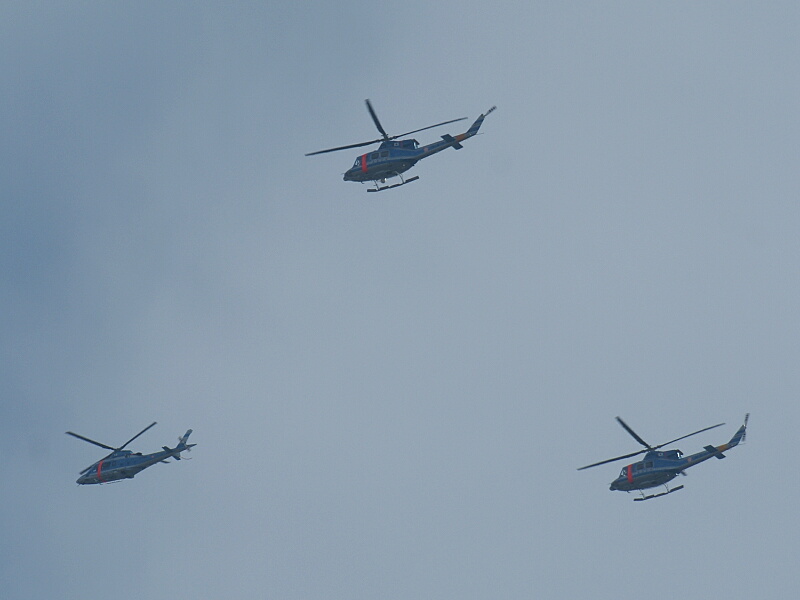 消防出初め式かなんかでデモフライト中(かその練習中)なんだろうなぁ‥‥‥と思っていると、今度は3機編隊のヘリがやって来た