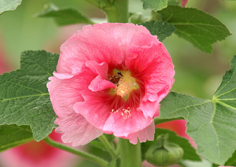というわけで、今日の一枚は以前撮ったストックの中から、「タチアオイの花の中で花粉まみれになって幸せそうなミツバチくん」です。
