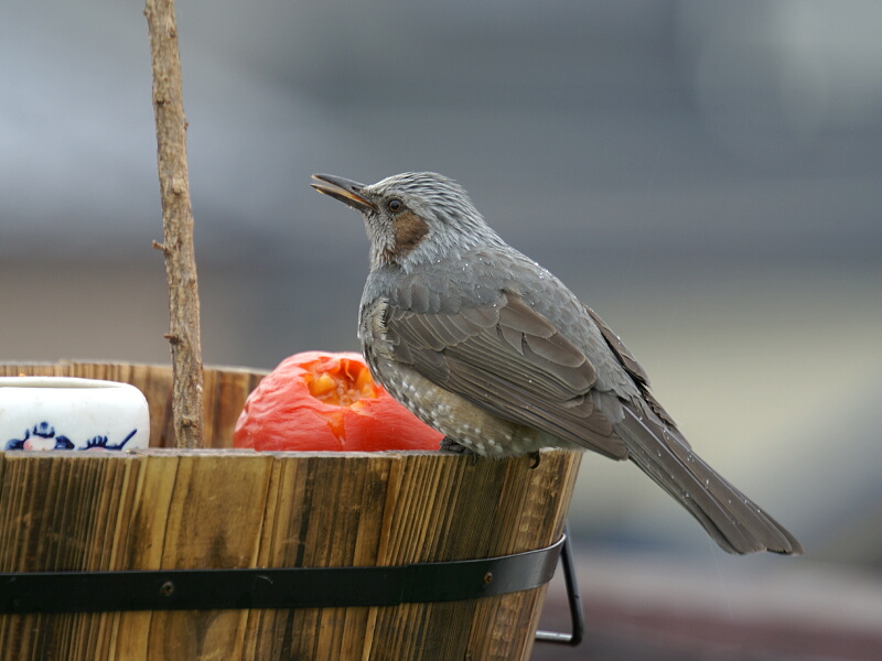 きょうは雨が降っていたので外に出られず残念。でも、屋上のドアを開けると、冬季限定の「餌付け場」に昨夜置いた柿(熟れすぎ)をヒヨドリがさっそく食べていました