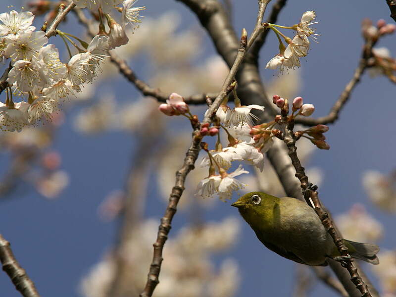 ↑三郷工業技術高校に咲いていた「ヒガンザクラ(だと思う)」と、その蜜を夢中で吸っていた