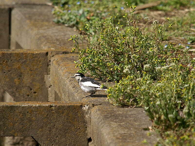 ↑植物にはあまり詳しくないけど、たぶん「ノボロギク」(黄色い花)と「ハクセキレイ」。奥には例の「オオイヌノフグリ」も写ってます。