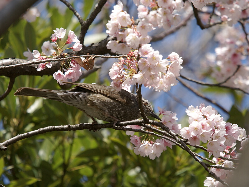 公園の中央付近には1本だけ早咲きの桜(おそらく「ヒガンザクラ」)の木がほぼ満開状態で、ヒヨドリが夢中で花を突っついていました↓