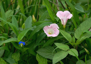 その場所は、市の方でツツジを植えたりしてあるのですが、よく見る普通の“雑草”に混ざって、ツル植物の“ビンボウカズラ”や“ヒルガオ”、さらには“ツユクサ”なども生い茂ってました