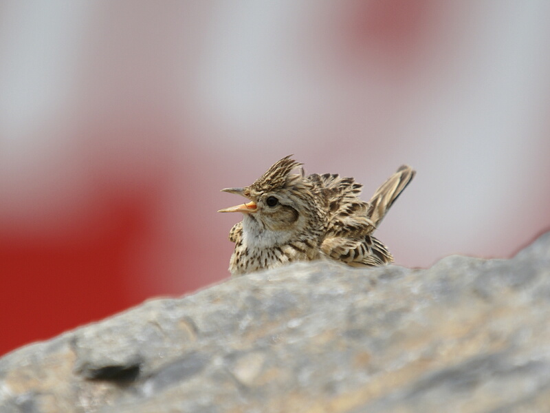 私は5コーナーで作業していたのですが、昼休みになった時に第13セクション内の大岩の上にヒバリが止まってしばらくさえずっていたので、その場面を撮影することができました。