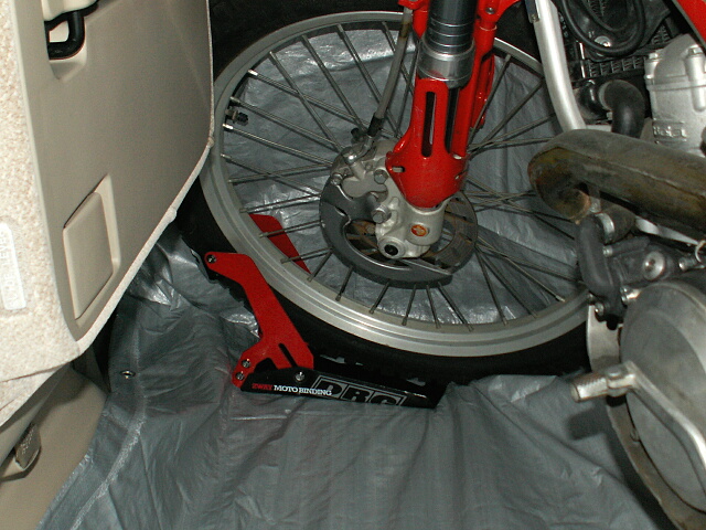 フロントタイヤの固定には「DRC 2ウェイモトバインディング」を使ってみたのですが、床に固定しなくても前輪を乗せてチューブの輪切りを使ってフロントブレーキを効かせた状態にするとバッチリ固定されました。おそらくタイダウンを引っ張る方向やハンドルの切り具合の力のバランスが良かったのだと思います。