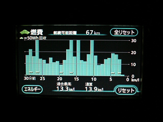 この写真は、TWKに帰ってきた時の「燃費グラフ」。出発前にリセットしたので今日の燃費は「13.9km/l」で、先週奥日光へ行った時の「13.3km/l」という過去最高記録を更新しました!