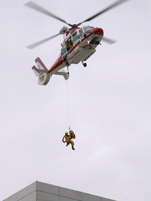 ↑「あらかわ1」による建物屋上へのホイスト降下&救助訓練。