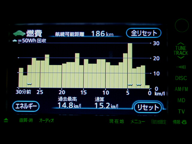 ↑出発前にリセットした「今日の燃費」は15.2km/l。過去最高記録更新です