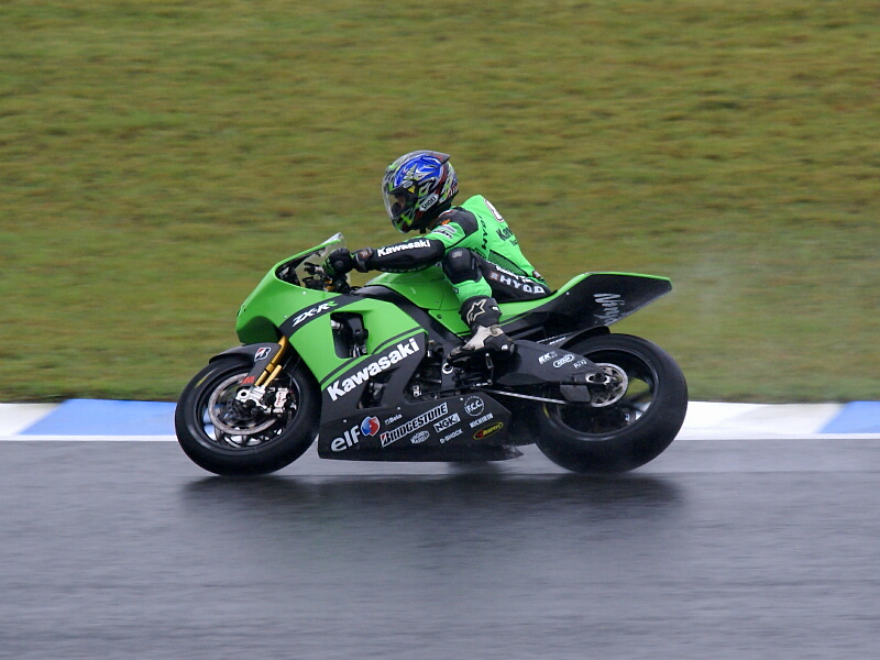 柳川選手は5年前の2002年、KawasakiがMotoGPクラスに参戦を始め、このもてぎで4スト990ccのニューマシンをデビューさせた時にそのプロトタイプマシンを駆って出場したのですが―――