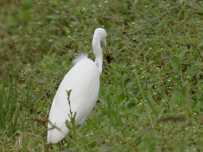 でも、チュウサギの方はあまり見かけないという話なので、たぶんダイサギだろう‥‥‥と思っていたら、一瞬目にも止まらぬ速さで頭を動かし、地面から何かをくわえ上げたようだ↓。