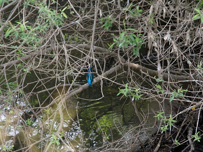 水面の方に目を凝らしてみるが、その姿は見えない。だがあの鳴き声はカワセミに間違いない。絶対この近くにいる―――そう思って見ていると、水面ギリギリを一直線に飛ぶ青い鳥の姿が見えた。やはりいたぞカワセミが!!