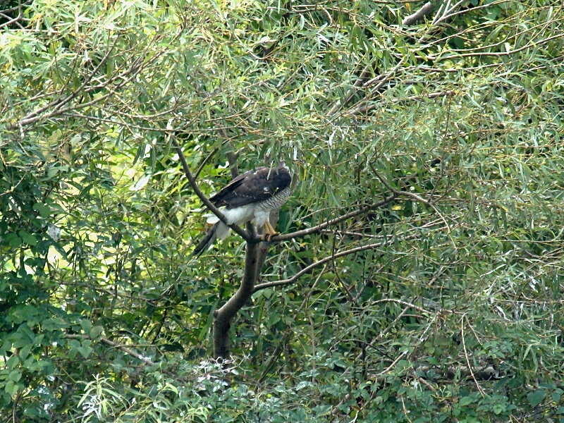 ―――まさに“野鳥の楽園”という感じだったのですが、急に小鳥たちが慌ただしく騒ぎ出し、その後静かになったと思うと間もなく1羽の大型の鳥が近くの木の茂みに降りて来た↓。