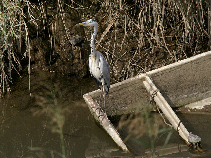 アオサギってちょっと「ツル」っぽい感じがしますが、この写真は周りに「カメ」も写っていて、なんだか「鶴と亀」みたいな、とてもメデタい絵になっています