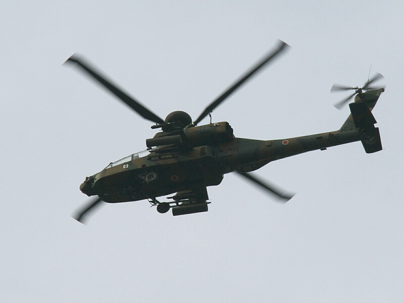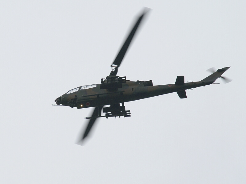 CH-47J、UH-1J、UH-60J、OH-6Dなどの見慣れたヘリに混ざって、OH-1“ニンジャ”やAH-1S“コブラ”、そしてついにこのヘリも私の前にその姿を見せたのでした―――↓