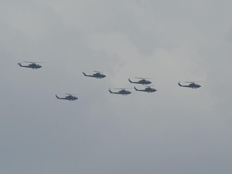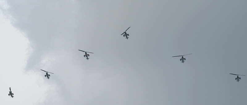 で、予行訓練1日目のきのう、朝パンを食べていたら「ドバドバドバ‥‥‥」というチヌーク様の音が聞こえたので慌てて屋上に上がると、すごい数の自衛隊ヘリ編隊が―――(@_@;)(@_@;)(@_@;)。すぐにカメラを持ってきて撮影したものの、あいにくのどんよりとした暗い曇り空で、つや消し迷彩塗装の陸自ヘリは真っ黒いシルエットにしか写らない状態