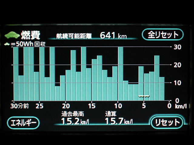 これはその時(真壁からの帰還時)のα-rd HVの車内モニターの画像ですが、前に書いたように今どきのクルマはHVでなくてもECUで管理されていて、そこに入ってくる「車速」と「燃料噴射量」のデータから「瞬間燃費」は簡単に算出できるので、それをグラフにした「燃費モニターモード」の画面です。