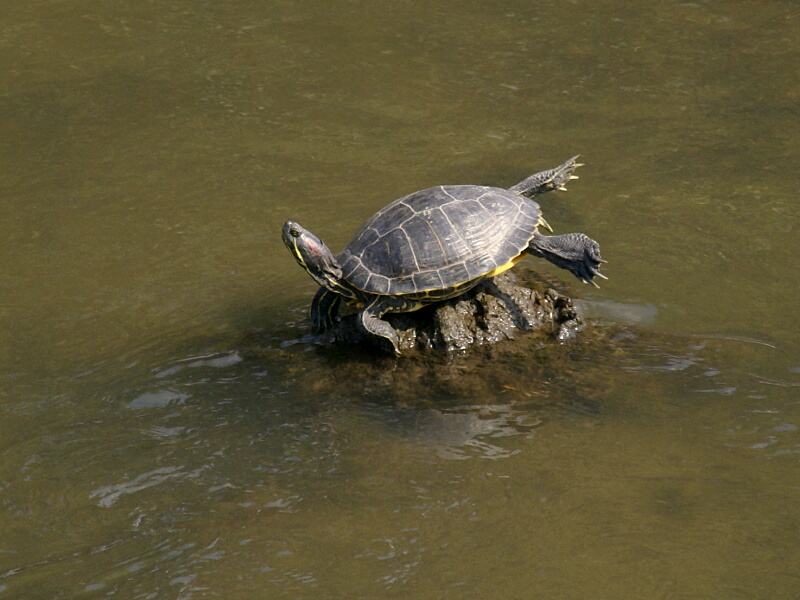 このあたりは、うちの長女が以前乗っていたマーチでカメを轢き殺し‥‥‥いや、轢きつぶし‥‥‥いやいや、カメの上を走ってしまった、というエピソードがあるくらいの“カメ繁殖地帯”だけのことはあって、そこらじゅうにカメの姿を見ることができるのですが、このカメはかなりウケる状態になっていましたね~~~