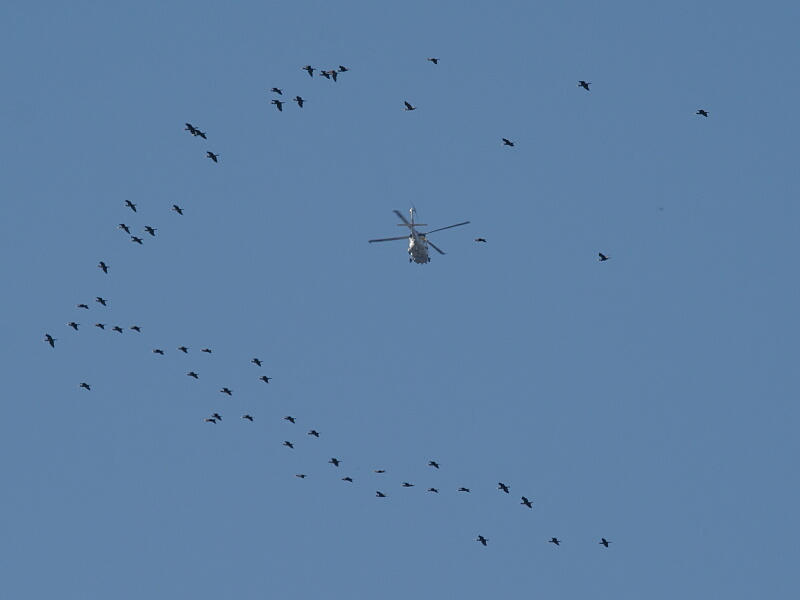 シルエットから判断して「カワウ」の集団移動のようですが、カワウさんたちもヘリコプターに負けじと「V字フォーメーション(かなり乱れがちだけど)」を形成しておりました