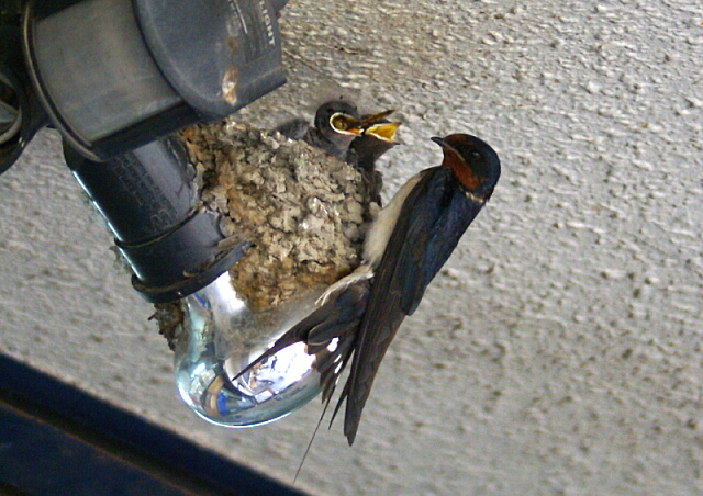 で、朝店のシャッターを開けると、ツバメの巣の下にヒナが食べ損なったトンボ(まだ生きてるけど、まさに“虫の息”)が落っこちてた。