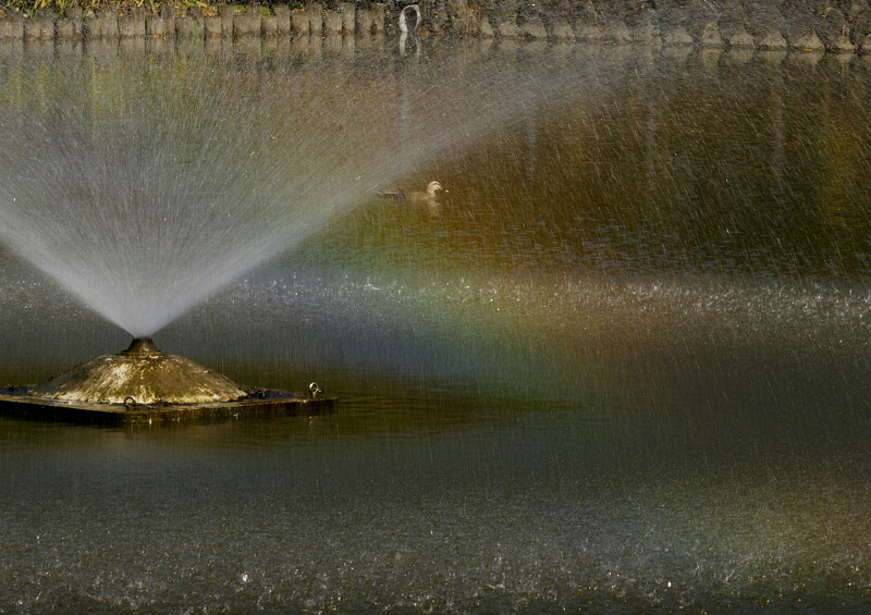 何枚かシャッターを切っていたら、偶然カルガモさんが虹の中を通過しました