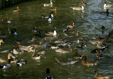 そして奥の「バリケンの池(←勝手に命名するな)」へ行ってみると、すごい数のカモ類がパンくずなどのエサをもらいに大集合してるところでした(@_@;)。