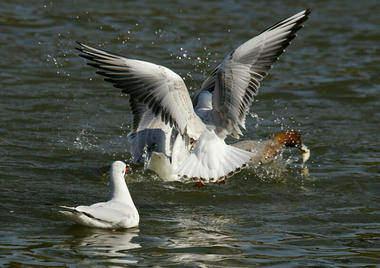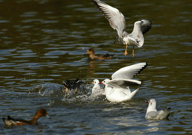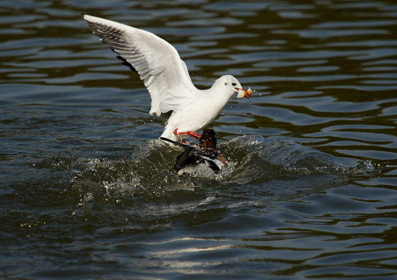 おーっと!!ユリカモメ軍団がヒドリガモのくわえてるパンくずを横取りしにやって来たぁ~~~っ!!