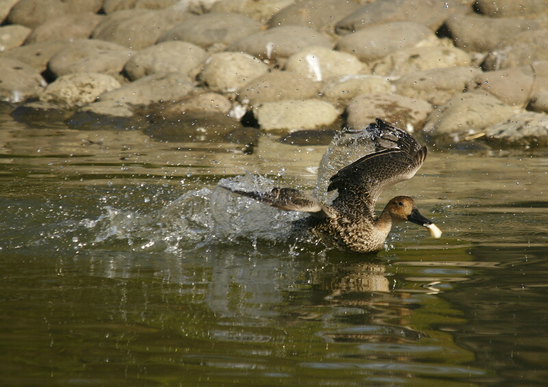 ↑パンをくわえて、なりふり構わず必死に逃げるオナガガモ(♀)さん