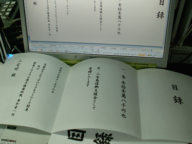 最初は、新潟中越沖地震の義援金に‥‥‥とも考えたのですが、私が行くことになった三宅島もまだ復興の途中。だったら、その復興支援金として受け取ってもらえないだろうか―――そう考え、その旨を先日三宅島の担当者の方にお話ししたところ大変喜んでいただき、16日夜のウェルカムパーティー席上で三宅村村長にお渡しする機会を用意していただく、という話になりました。