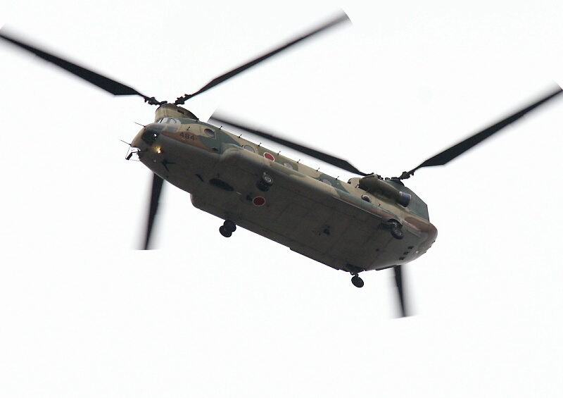 きょうの午前中、この辺ではめったに見かけない航空自衛隊のCH-47J“チヌーク”様がやって来ました↓。