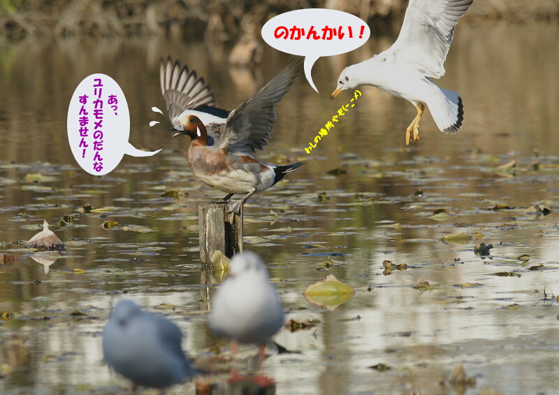 で、この他にもいろんな鳥を見ることができて癒されてきたんだけど、先日そうか公園で見たユリカモメVSヒドリガモの闘いがここでも展開されていたのでした↓↓↓