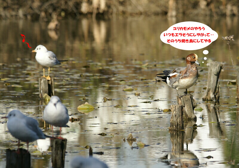 ↑ヒドリガモが杭の上で休んでいるところへユリカモメがやって来て、ヒドリガモを追っ払いその杭の上に止まるユリカモメ―――どうやら水鳥の世界では、ユリカモメはかなり威張ってるようである。