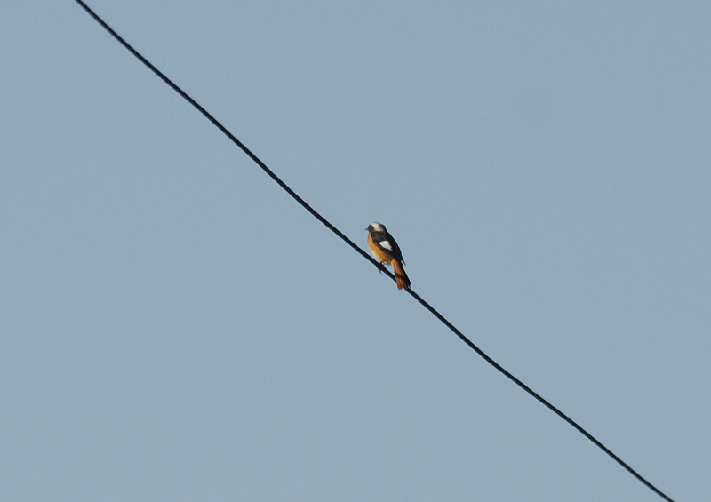 で、遠くの電線の上に止まっている小鳥がどうもスズメではない雰囲気なので、望遠で撮ってみると―――