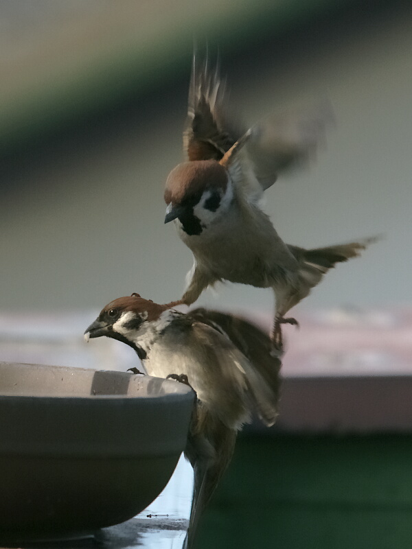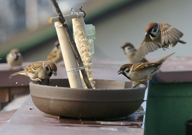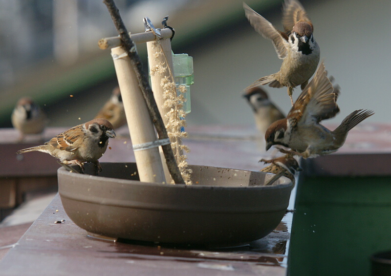 きょうもスズメたちは賑やかでした。最近は私が近くにいても無視して、夢中になってエサを食べています。