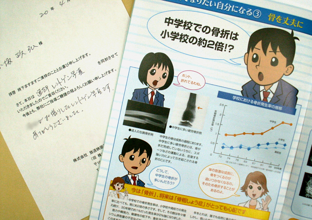 もうひとつは、社団法人日本酪農乳業協会が「平成19年度学校給食用牛乳消費定着促進事業」の一環として中学生向けに制作した「おどろき!ミルク博へようこそ」というA4版・19ページの冊子だが、その中の「骨を丈夫に」という項で、96年に北海道・夕張で開催された全日本トライアル大会中に左腕尺骨を骨折した私のその「骨折レントゲン写真」が、「成人の左腕骨折例」として使われている。