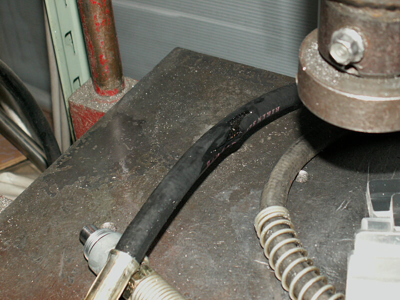 油圧プレス(20t)の高圧ホースが破れて、油のシャワーを浴びせられた‥‥‥(;_:)。
