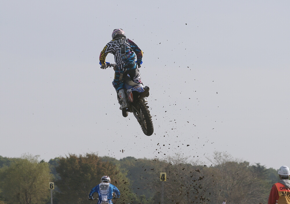 9月のモトパラ苗場もそうだったように、最近こういうデモンストレーションの仕事が多くなってきているが、本格的なトライアルデモンストレーションや、今回一緒に行なわれたフリースタイルモトクロスと比べると地味な事この上ないわれわれのデモンストレーション、いったい何を見せればいいのだ!?!?といつも悩んでしまうが、今回は本物の電柱とユンボで掘った深い溝とその脇にあった段差を使って、短い時間だったが少しはそれっぽい事ができたような気がする。