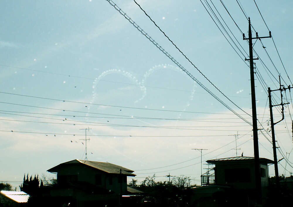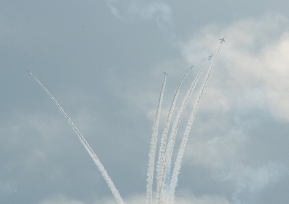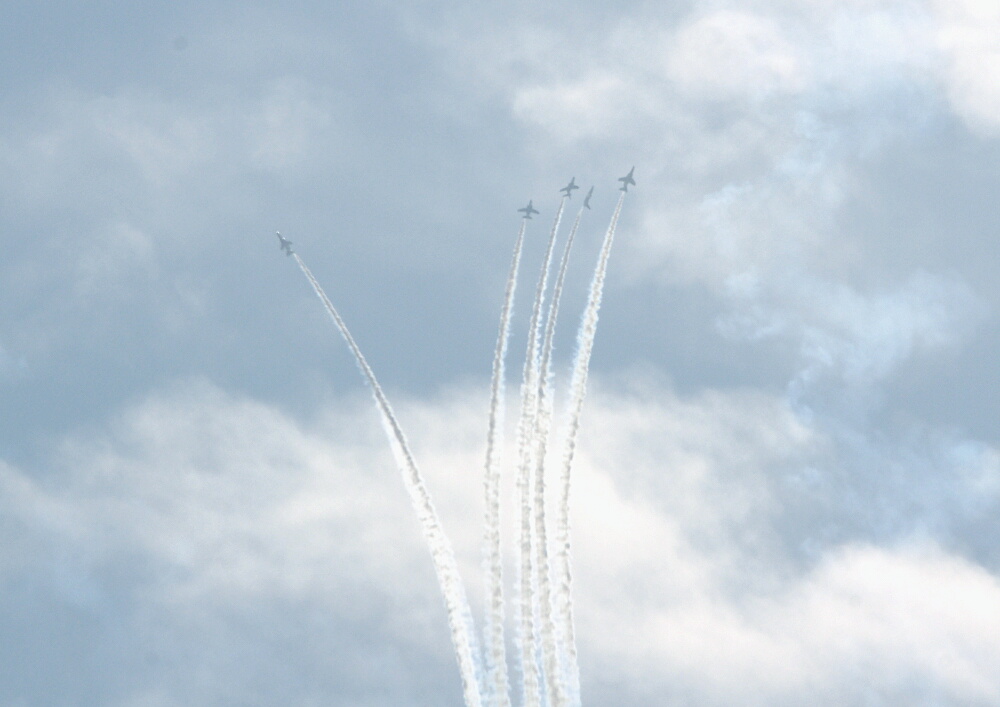 ブルーインパルスの演目の一つ“バーティカルキューピッド”だ!! もう予行演習は始まってしまったのか‥‥‥残念。でも、ブルーインパルスは先月12日に航空観閲式の予行演習でたっぷり見れたからまぁいいか。一ヶ月足らずの間に2回も観るなんて贅沢だし‥‥‥でも、あの時はこのワザやってくれなかったけど(ーー;)。