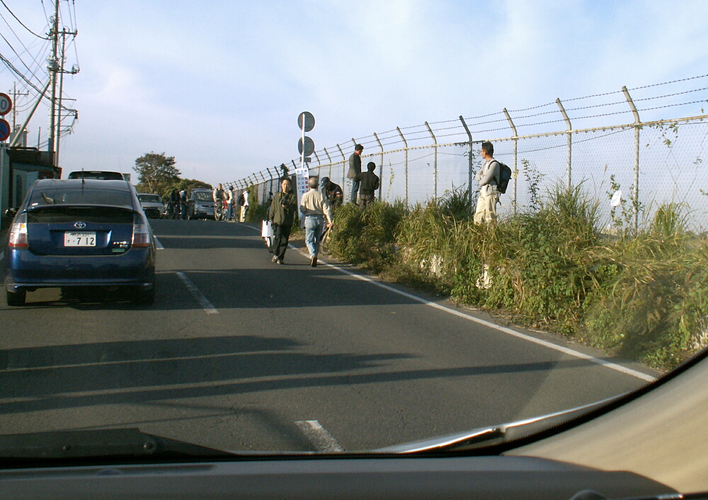 そして入間基地に近づくにつれ、「大砲装着」のカメラと脚立を持ったマニアらしきヒトが歩いてる姿を見かけるようになり、あと少しで基地、というところでクルマが大渋滞、ピタッと停まったままほとんど動かなくなってしまった。