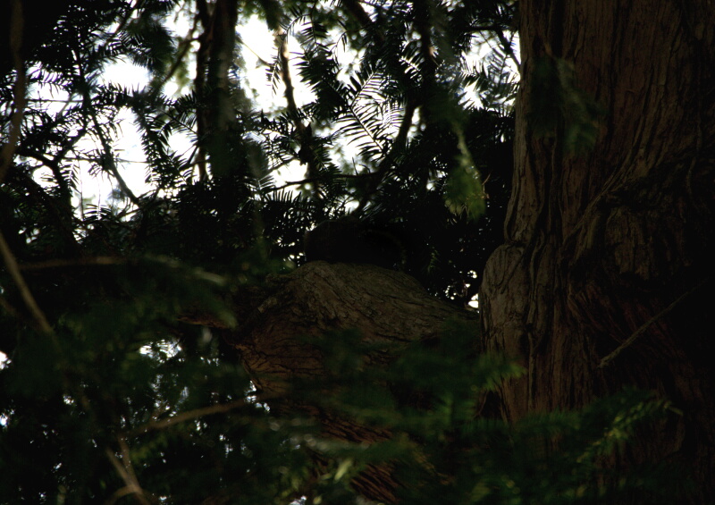 うっそうと茂った葉っぱで光がさえぎられたカヤの木の中心部は、まるでそこだけ夜のような真っ暗な状態(*_*;。さっきまで菅生沼でコハクチョウを撮るためシャッタースピードを早めに設定したままのα700では、ご覧のとおり真っ黒のボツ写真となってしまった。